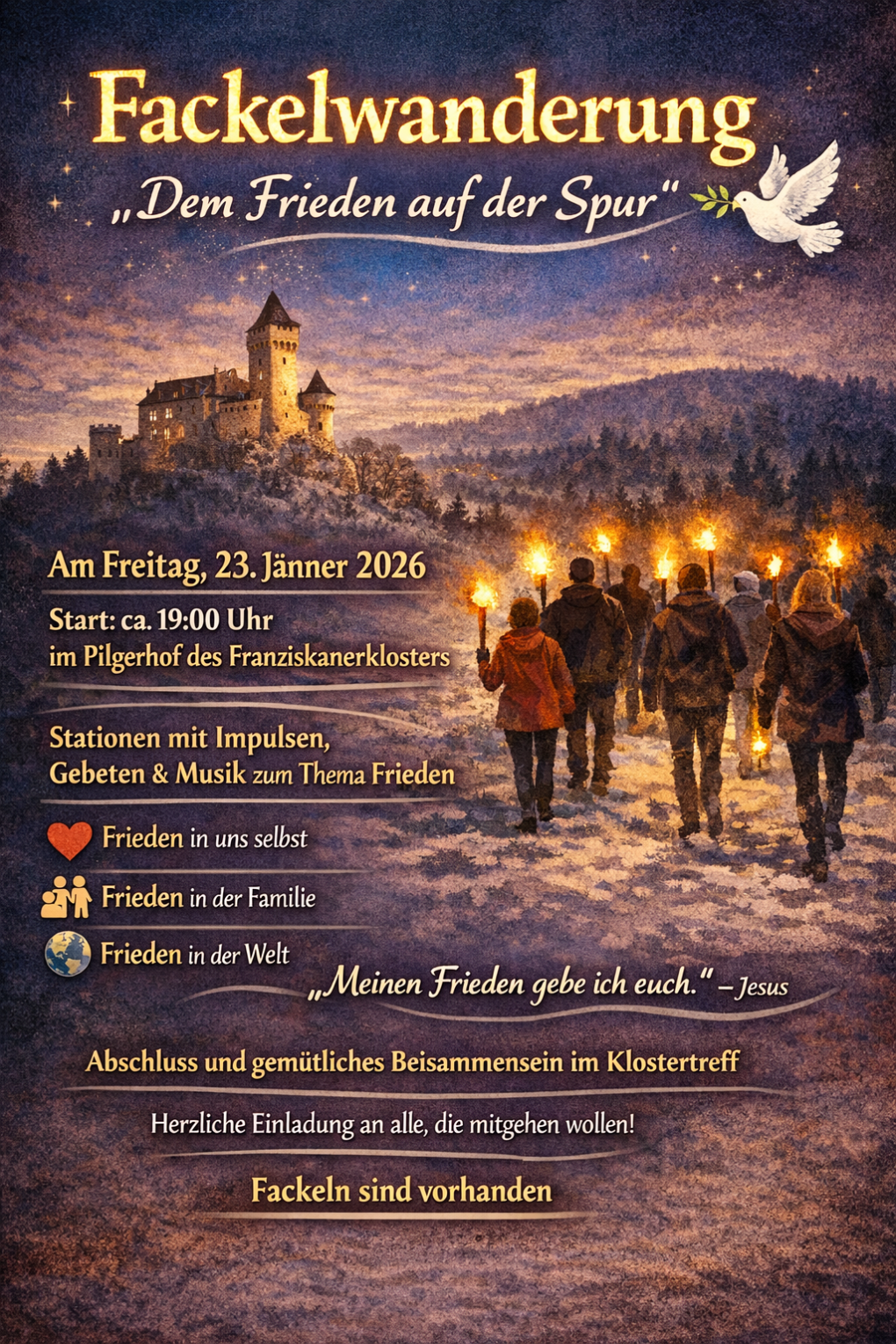 Am Freitag den 23.2. luden die Brüder Franziskaner aus Maria Enzersdorf zu einer Fackelwanderung ein. Wir trafen uns im Pilgerhof und fuhren in Fahrgemeinschaften zur Burg Liechtenstein. Nach einem gemeinsamen Gebet und spiritueller Einführung wurden die Fackeln angezündet. Im Licht der Fackeln und in Gesprächen gingen wir durch den Wald und konnten uns über das Licht, das Feuer und die Lichtmomente in unserem Leben austauschen.