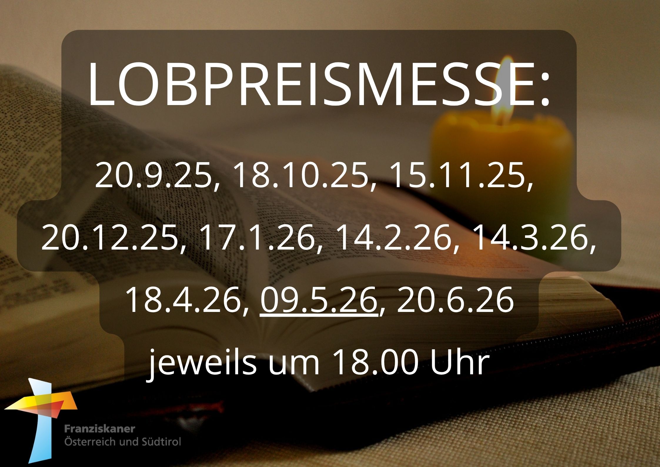 Am Vorabend des 3. Sonntags im Monat um 18:00 Uhr feiern wir in unserer Franziskanerkirche in Maria Enzersdorf eine Eucharistie mit Lobpreis. Eucharistie selbst ist der eigentliche Lobpreis der Kirche. Hier können wir Gott loben, obwohl wir dazu eigentlich nicht imstande sind. Christus ist derjenige, der uns seinen Heiligen Geist schenkt, damit wir den Vater preisen können. In unserer Franziskanerkirche wollen wir diesen Aspekt der Eucharistie hervorheben und so Gott einfach preisen und loben mit allem was wir haben.